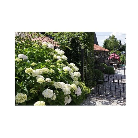 Beautifully simple, pure white blooms, each with a tiny blue eye, are produced en-masse on this variety of the popular garden shrub, Hydrangea macrophylla ‘Soeur Thérèse’, named for the famous nun, Mother Theresa, has a darker green foliage which really helps show off its flowers, which will fade to have a pale pink hue later in the season. Easy to grow and keep, Hydrangeas are a perfect addition to any garden, large or small, as they provide interest and colour throughout the year. Height: 150cm (59″). Spread: 150cm (59″).