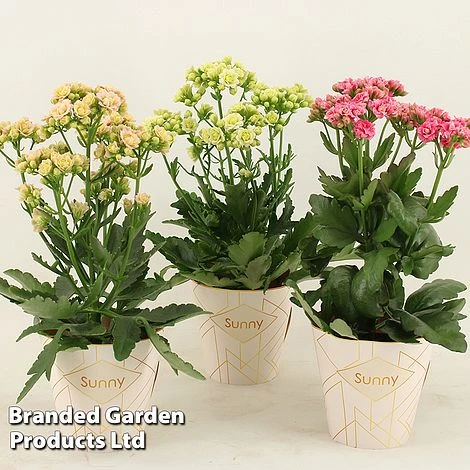 This trio of rose-pink, pale pink and white Kalanchoe makes a colourful display that, unlike cut flowers, lasts for weeks. The rose-bud-like blooms are held high above neat domes of scallop-edged foliage. These compact houseplants are the perfect size for a tabletop, shelf or windowsill and require little watering or care. Height and spread: 20-30cm (8-12in).