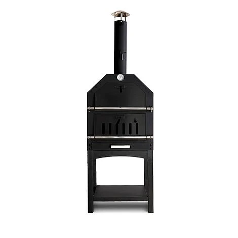 The stylish black multi function pizza oven comes complete with a pizza stone, perfect for pizzas up to 12”. Also included is a chrome cooking grill so it can be used as a BBQ. It benefits from a flue damper and air vents, making for the perfect pizza cooking experience . This is a wood fired pizza oven and is easy to operate, simply light a wood fire in the bottom chamber and use the temperature gauge to get to the perfect cooking heat. The chrome plated cooking grill can be used for fish, vegetables, meat and all the other typical BBQ food. In this case, lumpwood charcoal can be used. If you are feeling a little adventurous, it can also be used as a smoker by adding smoking chips to the log or charcoal fire and closing the upper door. There is also a storage shelf for keeping items within easy reach. The instructions are easy to read with helpful diagrams and contain information on how to operate the 4 cooking options.