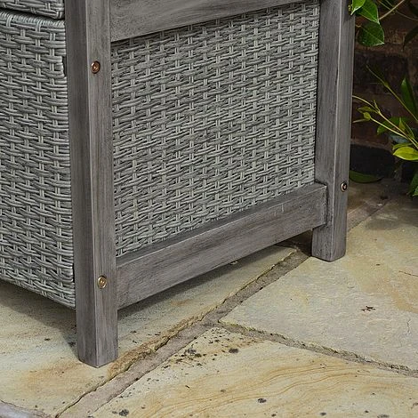 The Alderley Rattan Storage Bench cleverly combines storage with a practical seating solution. It is constructed from a weatherproof rattan weave effect on a well built FSC approved timber frame which has been finished in a modern grey wash and lacquer finish. The storage box is easy accessible from the lift up seat and has an approx capacity of 150 litres. The seat cushion is included.