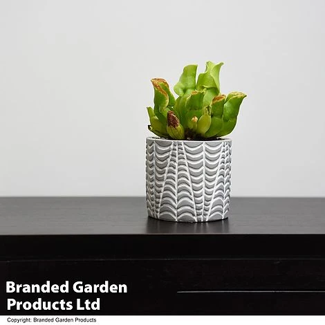 Sarracenia purpurea subsp.venosa forms short, squat pitchers that are greenish purple, sometimes turning completely purple. The lid doesn’t cover the pitcher but forms ear-like wings that curl inward and are covered in rough hairs. This species earns the name ‘venosa’ due to its highly conspicuous veins that branch in tree-like patterns over the pitcher and lids. Sweet secretions on the lip of the pitcher lure unsuspecting insects that slide down the slippery funnel, tumbling to their deaths in a pool of digestive juices at the bottom. This Sarracenia makes an unusual specimen for a greenhouse, conservatory or windowsill and an ideal gift for the botanically curious. Maximum height and spread: 50cm (20in).