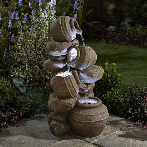 This attractive water feature is well suited to a range of garden styles, from cottage to modern. It is made from polyresin, which is frost resistant. Simple to set up, just add water, then plug in. The water will start trickling from the jugs, into the urn, and in the evening they are illuminated by an LED light.
