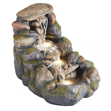 Create a beautiful focal point in your garden and outdoor space with this eye-catching cascading bowl water feature from Serenity. The realistic rocks form a cascading feature with rock pools forming at each level. The water is pumped from the reservoir at the bottom up to the top to cascade continuously. Constructed from durable weatherproof polyresin that will not rust or crack. It will excite your eyes and ears as you listen to the gentle flow of water. By night it is transformed with the LED’s lighting the rock pools and illuminating the cascading water flow.