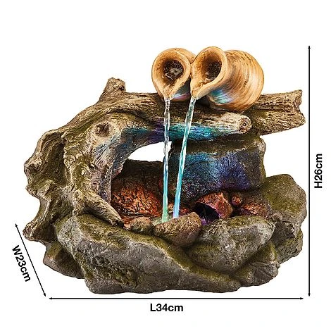 It just needs to be filled with water, then plugged into a mains electric socket. The water will start flowing continuously from the jugs. When it is dark, the water feature is illuminated with LED light.