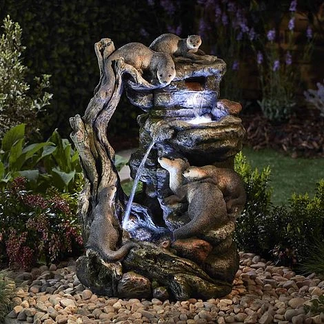 The water feature is made from weather resistant polyresin, and features a family of otters, looking inquisitively at the flowing water. Once filled with water, simply plug it in to a mains electric point, and the pump will start moving the water continuously. At night LED lights illuminate the water.