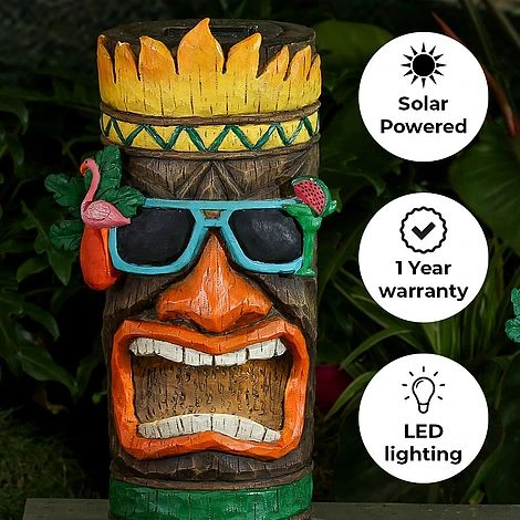 A striking garden solar ornament with vivid colours and an attention grabbing Tiki design, which is made to look as if it is ‘carved in wood’. This Tiki ornament even sports sunglasses with watermelon and a flamingo on! This Tiki ornament is an excellent way of adding colour and a lively atmosphere to any outdoor space. Perfect for lighting up darker corners of the garden or pathways.
